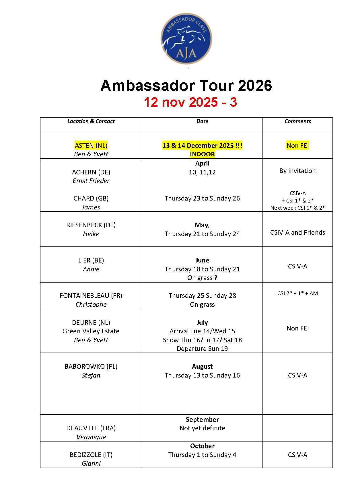 Deurne (NL) 17.-19.07.2025 European AJA Championship Die Prüfungen beginnen Donnerstag früh und enden Samstag Nachmittag. Für Sonntag früh ist die Rückreise geplant. Es gibt eine neue Teilnehmerliste 62 Reiter mit 87 Pferden aus 5 Ländern: 38 Deutsche, 17 Franzosen, 14 Holländer, 9 Engländer und 9 Belgier Hier Starterlisten/Ergebnisse bitte dort immer runterscrollen, Donnerstag 9.15 Uhr geht es los Wer seinen AJA-Beitrag 2025 (100€) nicht bezahlt hat, kann nur an den "Guest"-Prüfungen teilnehmen. Kein FEI-Pass nötwendig, kein VET-Check, kein Kreisveterinär. |